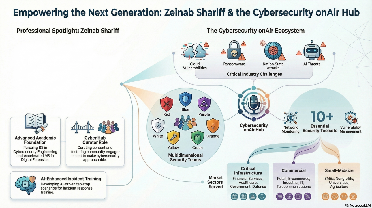 The Cybersecurity onAir network serves as a comprehensive, human-centered platform designed to demystify cybersecurity for students, professionals, and various market sectors. By integrating academic rigor—primarily through its association with George Mason University (GMU)—with community engagement, the network addresses critical vulnerabilities ranging from AI threats to nation-state attacks. Central to this ecosystem is the work of Cyber Hub Curator Zeinab Jafar Shariff, whose professional focus bridges the gap between technical engineering and accessible cybersecurity education. This document synthesizes the network’s organizational structure, identifies the primary challenges facing the industry, and outlines the professional competencies required to navigate the modern threat landscape.